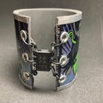 These handcrafted cuffs are made from craft beer cans. This cuff came from Pipeworks Brewery's Close Encounter Black IPA brew. The rad artwork, which inspired the collection, was done by local artist, Jason Burke, of Ink and Lead Designs. These are lined with a thick, soft, comfy rubber and laced with rubber cord so they can be adjusted. Each cuff is one of a kind.