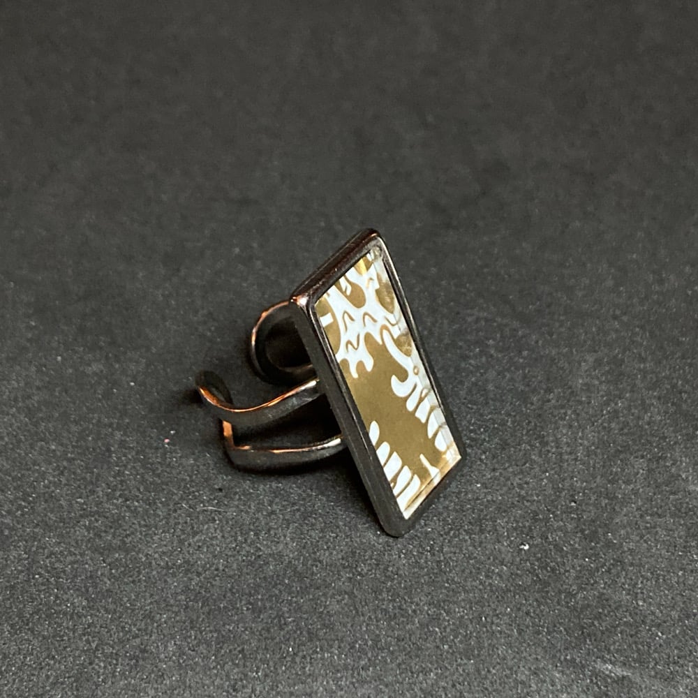 Adjustable, stainless steel ring with Liquid Death graphic.
