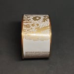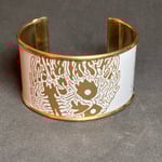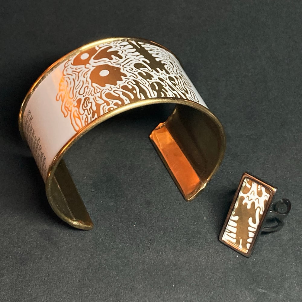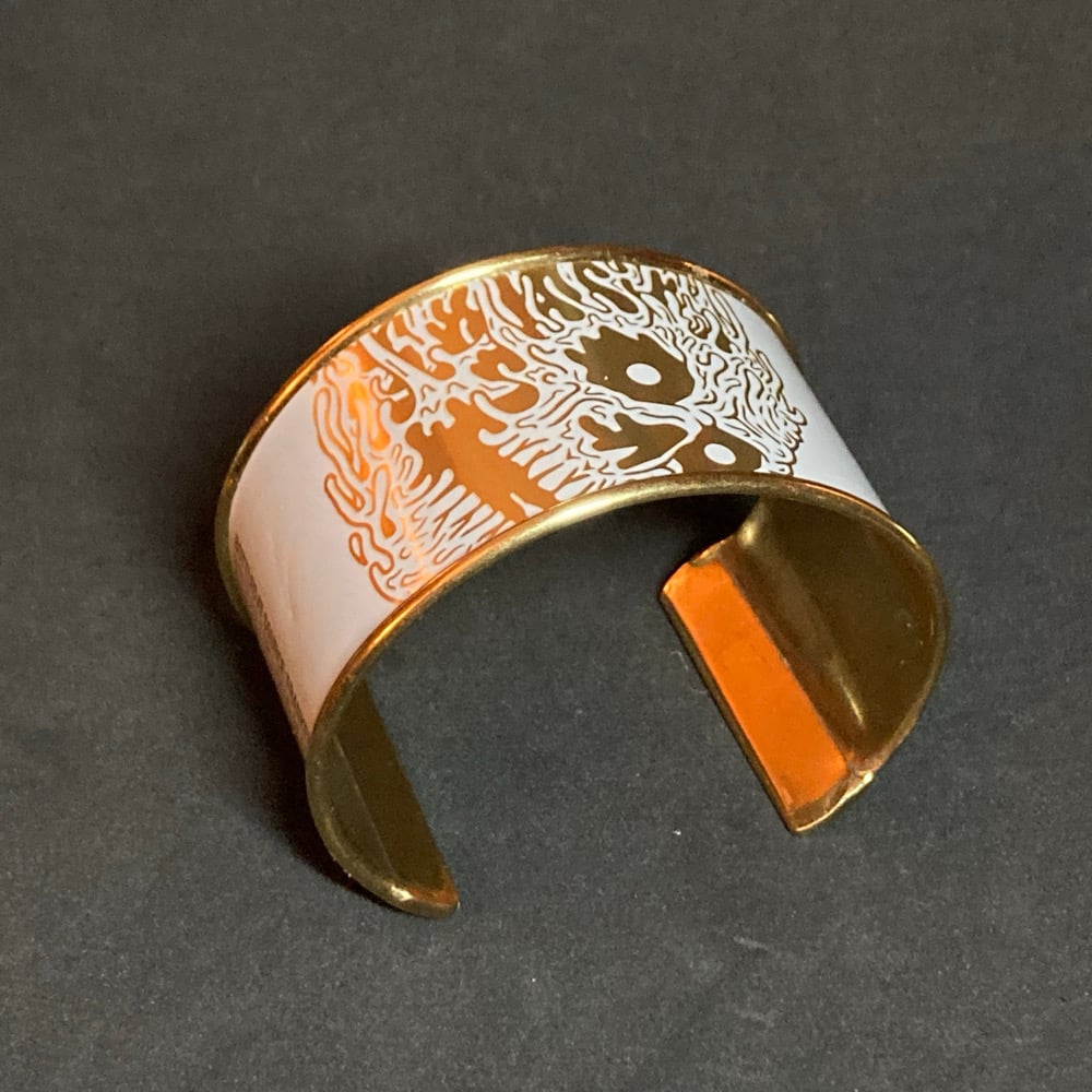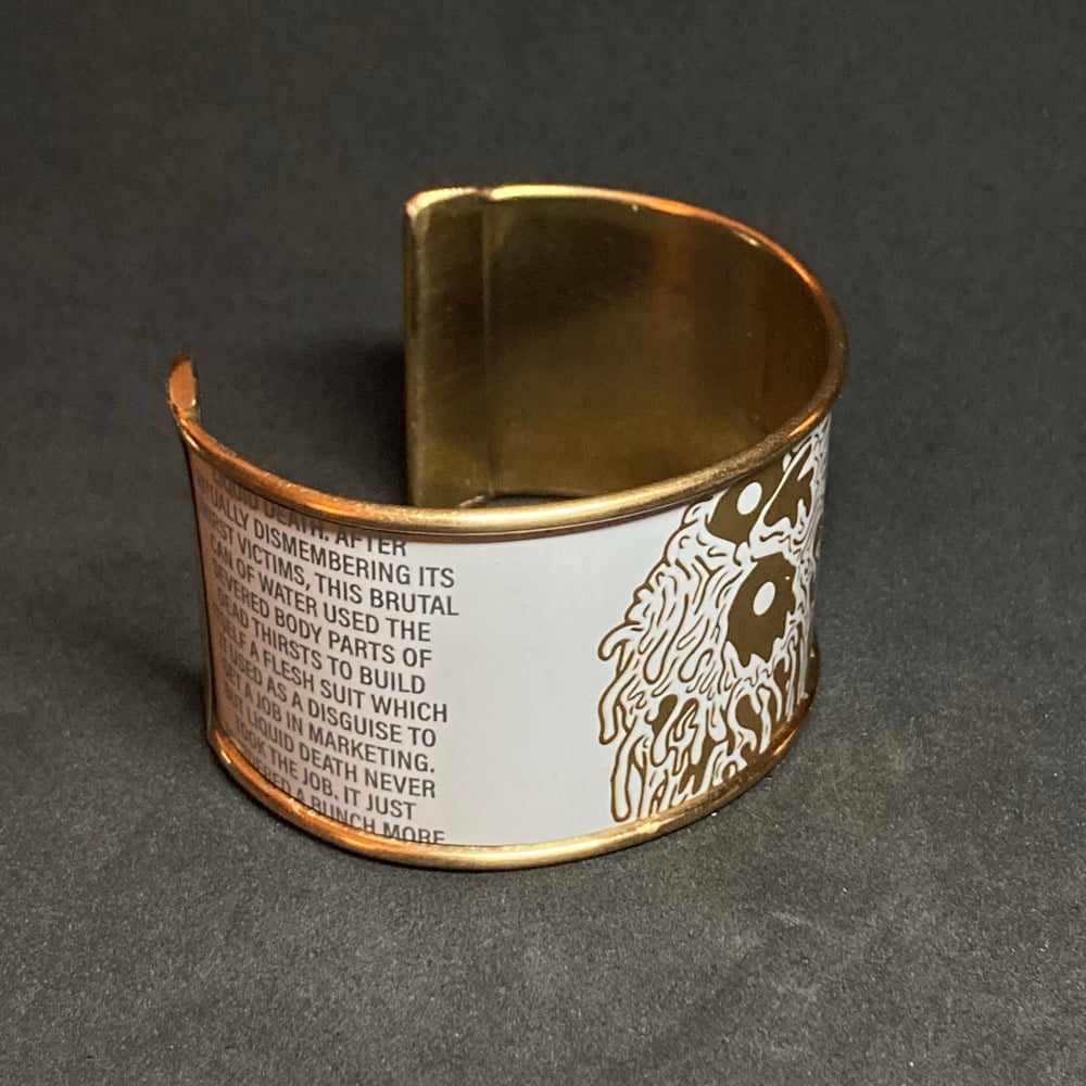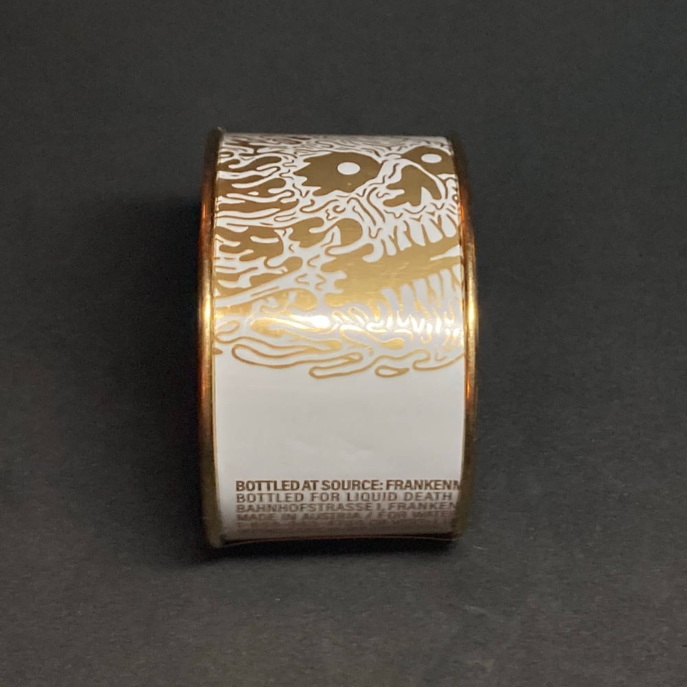 These handcrafted cuffs are made from aluminum cans. This design is from Liquid Death Water.