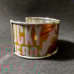 These handcrafted cuffs are made from recycled craft beer cans. This cuff comes from Chicago's Revolution Brewery. Each cuff is one of a kind.