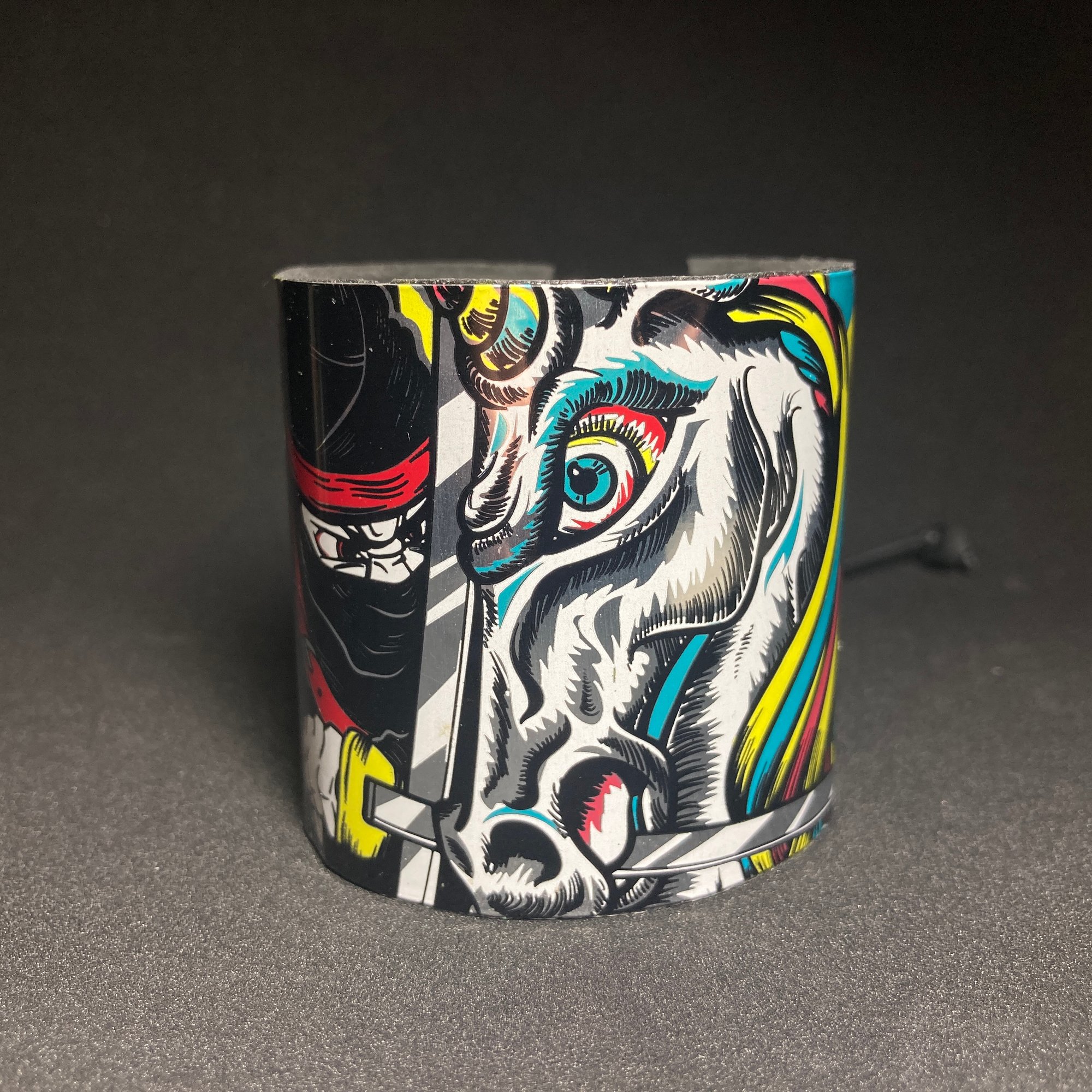 These handcrafted cuffs are made from craft beer cans. This cuff came from Pipeworks Brewery's Ninja vs Unicorn brew and the rad artwork, which inspired the collection, was done by local artist Jason Burke, of Ink and Lead Designs. These are lined with a thick soft, comfy rubber and laced with rubber cord so they can be adjusted. Each cuff is one of a kind.