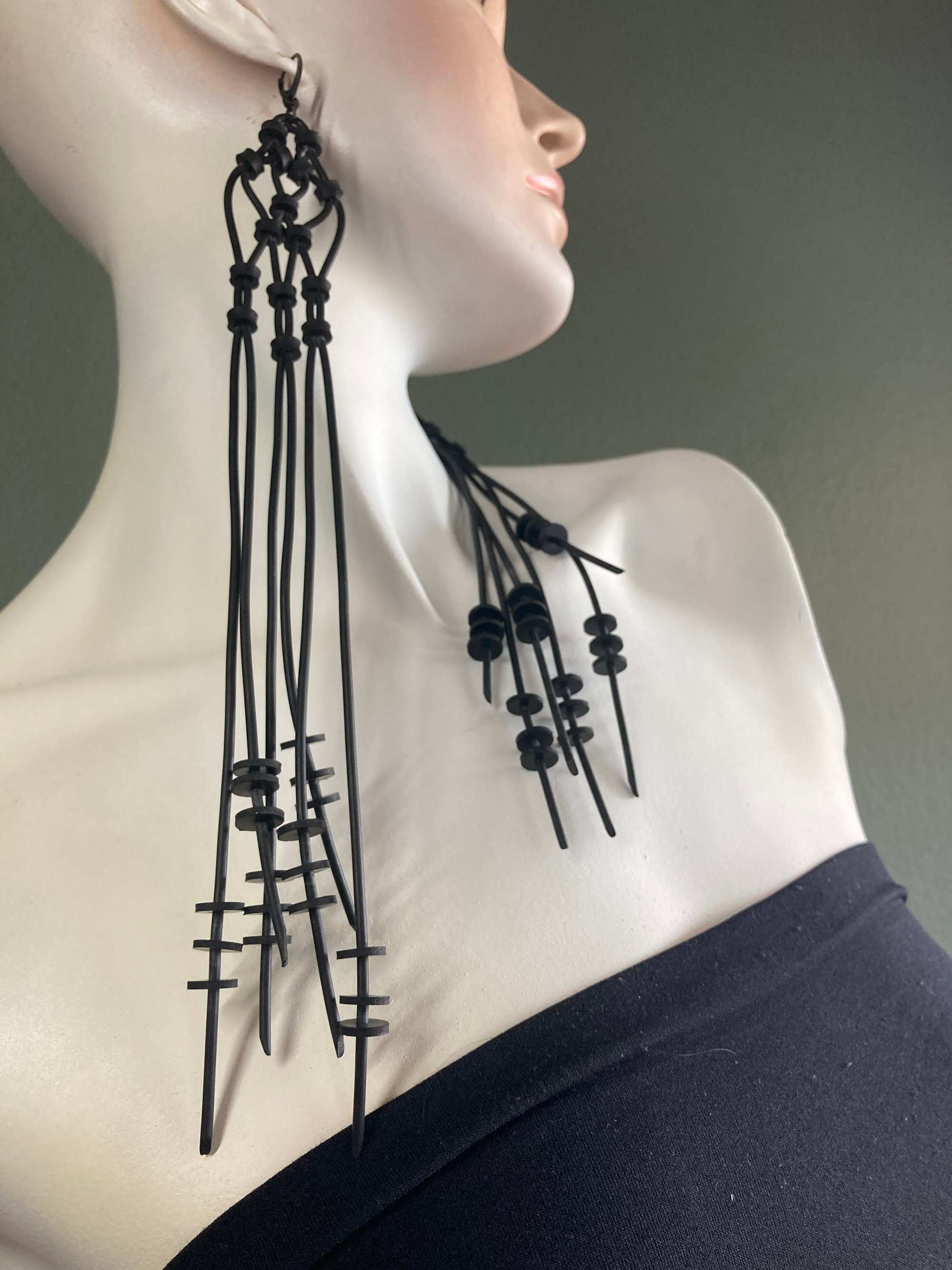 This collection is inspired by flowing cnidarians, sea organisms characterized by their poisonous tentacles, that are used for capturing food. Made from upcycled rubber cord, collected from my favorite San Francisco recycling center.