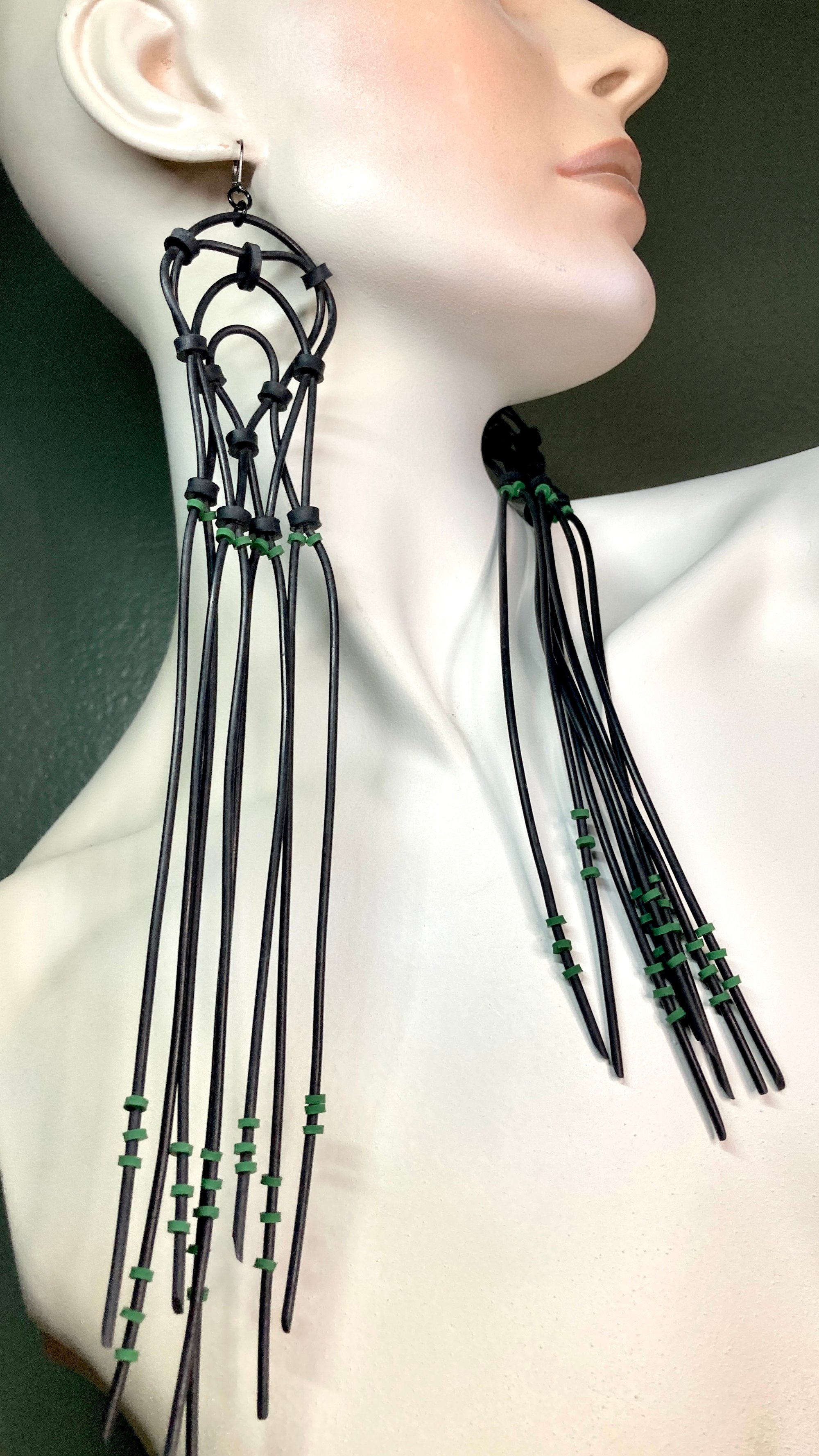 These are fun to make because every pair is one of a kind, and I am never sure how they will turn out until I am finished. They are very lightweight and can be trimmed to a shorter length if you prefer but, I assure you, they are stunning long.