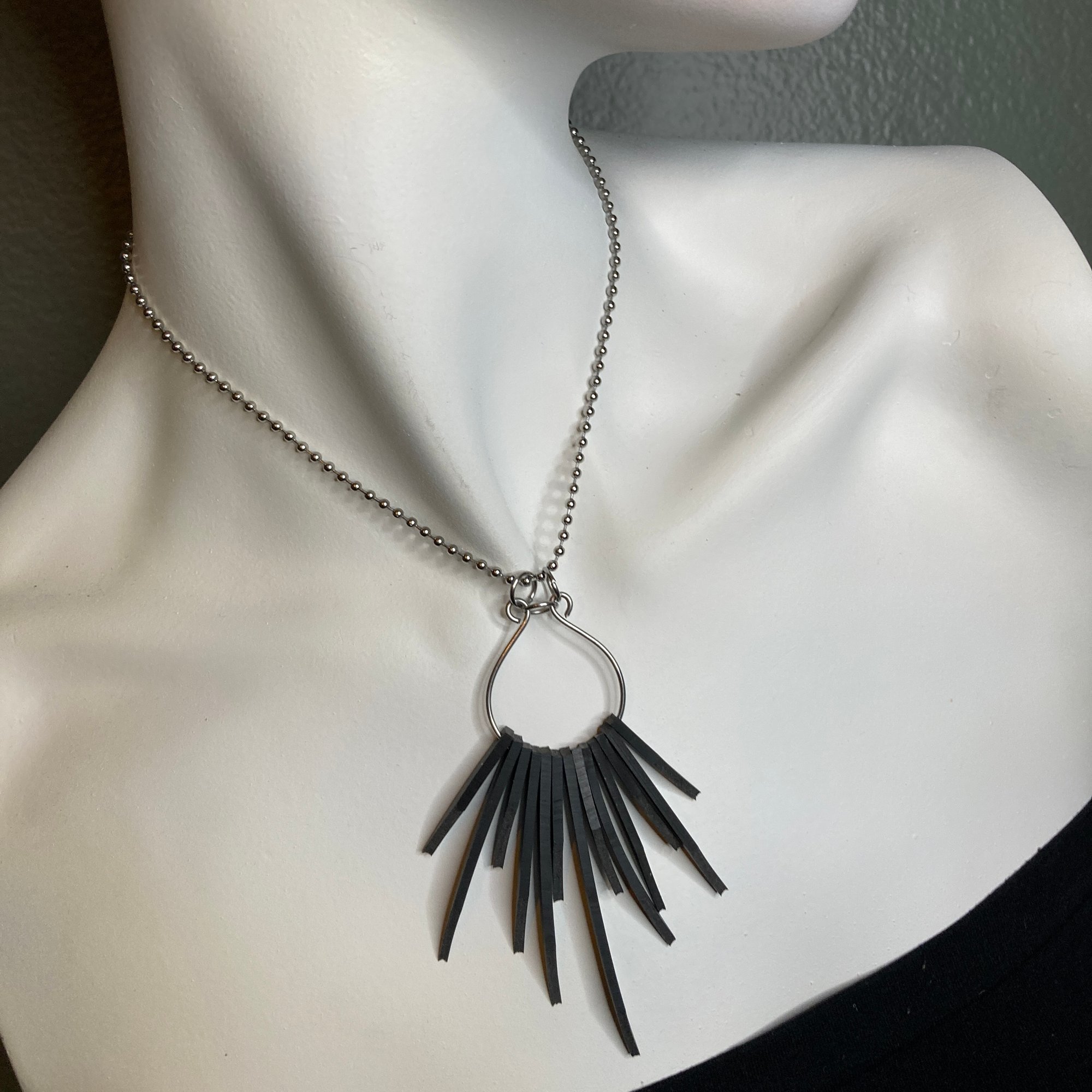 This necklace is created from stainless steel wire and the labels of EFFEN Vodka bottles recycled from the Metro in Chicago. It is on a 36" adjustable stainless steel ball chain. Please specify if you would like a custom length in checkout notes.